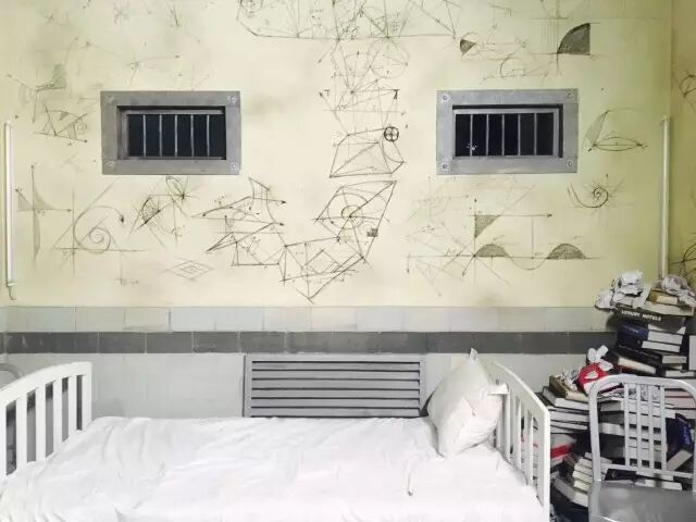 根据工作人员的介绍,这是剧组花两个星期搭的,这个戏棚占地四百平方米,为了营造精神病院的混乱场景,地面上一片狼藉,而墙上则画满了数学公式的涂鸦,颇为疯狂——而且还有种性冷淡的美感......