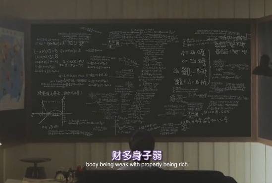 现场,有记者问到墙上的数学公式。“其实墙上那么多乱七八糟的东西,都是有它的意义所在,当然从影像化的表现来说这是(墙上的几何图形)假的,是属于道具的一部分。”