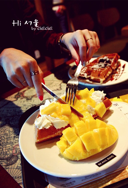 种类特别丰富的华夫饼,上面浇着冰淇淋(或奶油什么的)再覆盖各种水果,点了这里的招牌,mango的确从来不会失望。