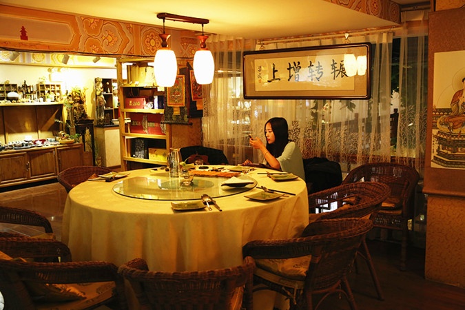 福慧慈缘楼上的两张大桌适合多人聚餐,座椅都是藤编+蒲团,餐具也算讲究,柔和的灯光太适合几个闺蜜谈心啦~