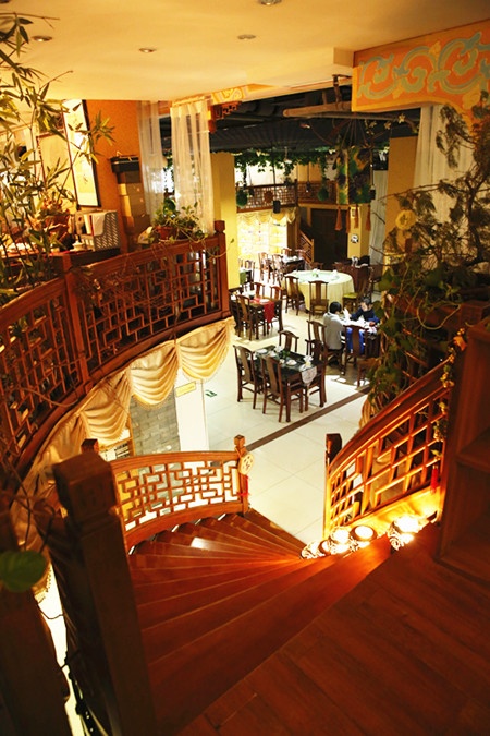 王府井锡拉胡同本来就很窄,汽车都进不去,也可想而知这家素食馆儿的门脸了,一点也不大气宽阔的,但进门后,,,,光是这挑高就不得不惊讶了~