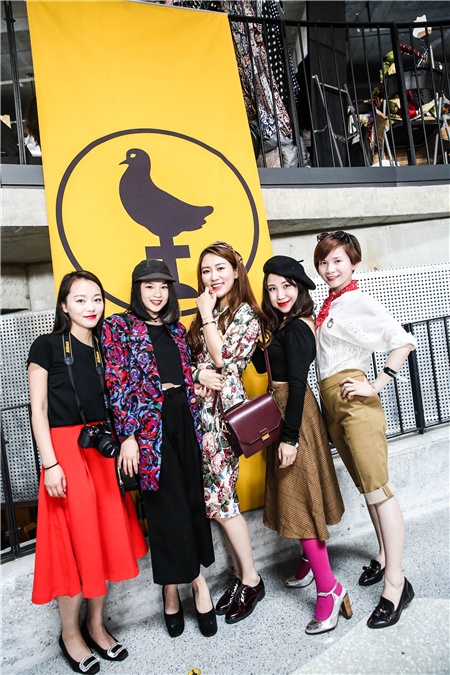 左起:美容博主lilytiti、搭配达人大岛、我、瑞丽美容编辑hana、时尚博主赵赵,都是一副要把古着进行到底的专业范儿。