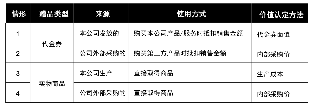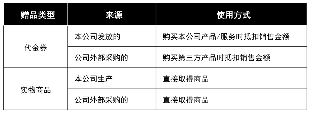 实务中赠品的发放形式多种多样,有采购消费券、代金券赠送给客户的,有直接采购实物商品赠送给客户的。为便于讨论和理解,笔者根据赠品的来源和使用方式,将赠品分为如下几种情形,并分别选取相关案例进行讨论。