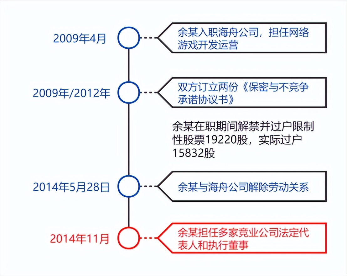 基本事实请见以上时间轴。入职海舟公司后,公司与余某签订《保密与不竞争协议》,以股票作为竞业限制义务的对价。余某在离职后的一个月内入职了海舟公司的竞争企业。海舟公司就此提起劳动仲裁,要求余某按约定返还股票及其收益。仲裁委以海舟公司的请求不属于劳动争议受理范围为由,通知不予受理。海舟公司对此不服,遂向法院起诉。其主张得到了法院的支持,法院裁判理由摘要如下: