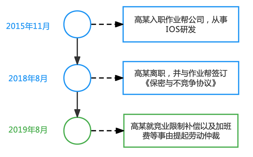 基本事实请见以上时间轴。高某2015年入职作业帮公司,2018年8月离职,并与作业帮签订《保密与不竞争协议》。而后,2019年8月,高某提起劳动仲裁,要求作业帮支付竞业限制补偿。因仲裁委不支持该请求,高某向法院提起诉讼。一审法院驳回了高某关于竞业限制补偿的请求。二审法院改判,支持了高某的该项诉讼请求。二审法院的裁判理由摘要如下: