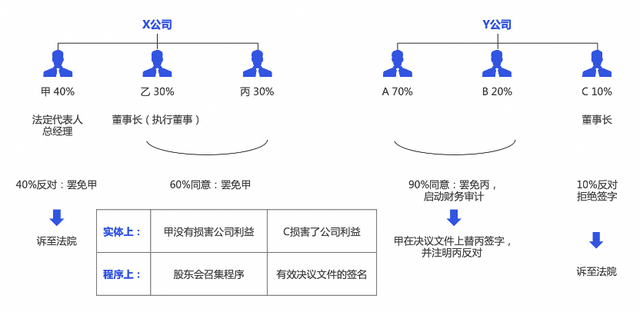 我们再来看一组案例:X公司有三位股东:甲40%、乙30%、丙30%,甲担任法定代表人、总经理,乙担任董事长。股东之间产生矛盾,乙召集股东会,提出公司在甲的主导下违规经营,被市场监督局处罚,要求罢免甲。甲提出,该项目不是其主导的,他只是执行者,乙和丙对相关事宜完全知情并同意。但是,当天依然形成了股东会决议,乙、丙签署了同意罢免甲的意见,甲反对。60%同意,40%反对。甲起诉到法院,提交了乙的邮件,内容是乙安排给甲相关业务,并且该邮件抄送了丙,不仅如此,证据表明,供应商是乙介绍的,丙也表示赞同。请问法院会如何处理?