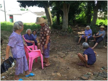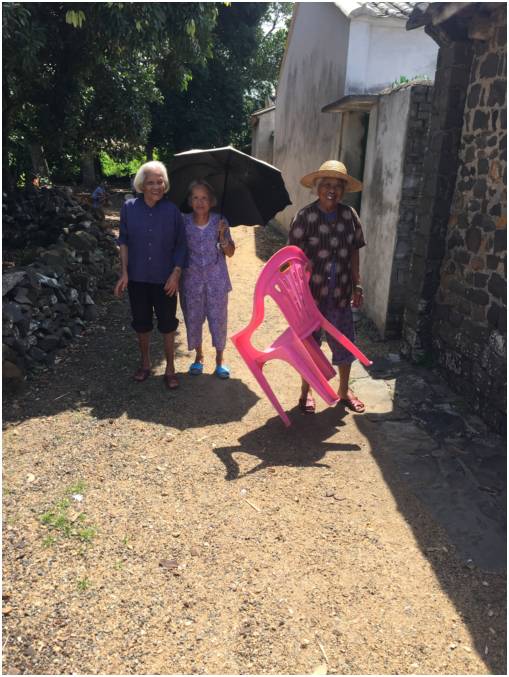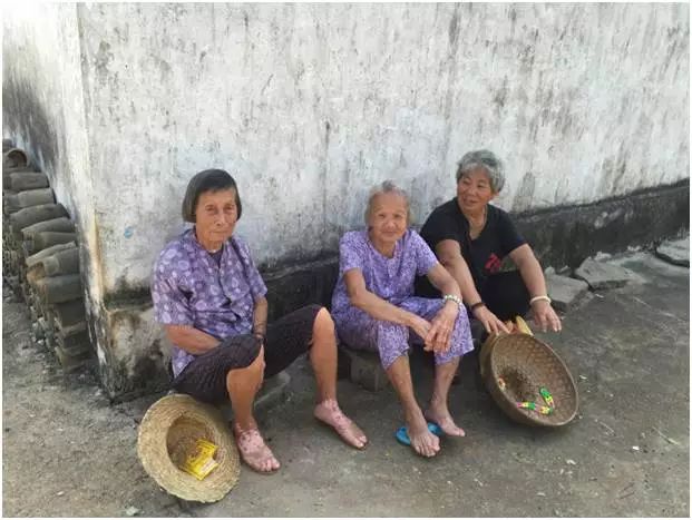 打扫完成,屋前屋后的邻居老年人闲聚一块,三人齐坐屋檐小石板。