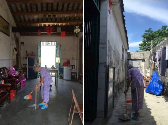 手里拿的不是拐杖,而是扫把,打扫着屋里屋外的卫生。