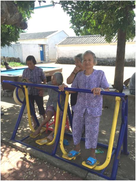 悠闲散步到村中休闲中心,在闲聊之余,老人们不忘在健身器材上锻炼身体,活动筋骨。健康的身体让她们能自由的活动着。