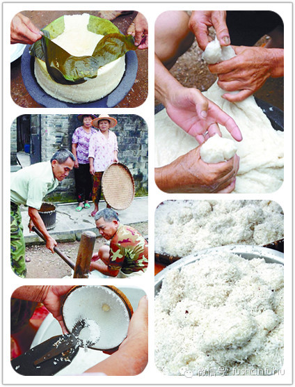 同时,拔粑也是一项耍杂技般艰苦的过程,要靠勇敢不怕烫手才能完成。每舂一下,用双手插进几十度高温的臼底下把粑翻起来,将有米粒的地方长长地拉起,放在臼中间,让木棰继续舂。如果烫手了,可随时把手放在事先准备的冷水里冷却一下,但是上百回的翻弄,的确需要点技术和勇气。这技术活也是老符在承担。