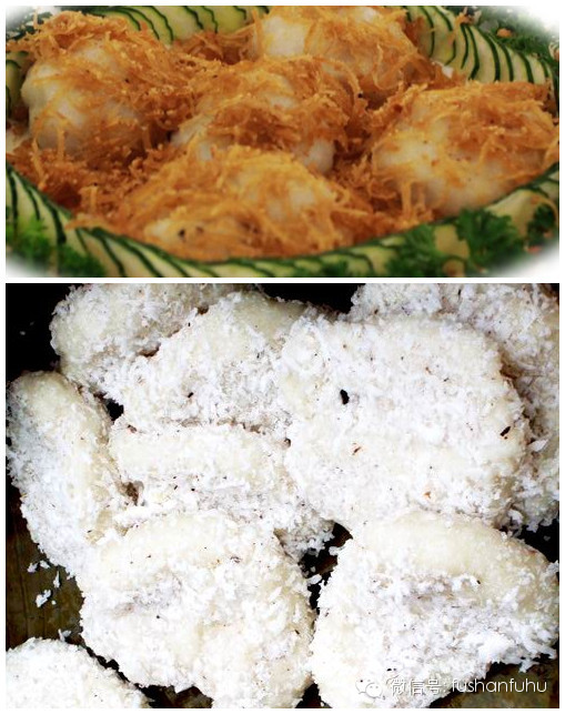传统椰子粑的制作过程:①将浸泡四五个小时的糯米蒸熟②舂粑是最艰苦的工序③刨椰丝④挤椰子粑⑤裹上椰丝后制成