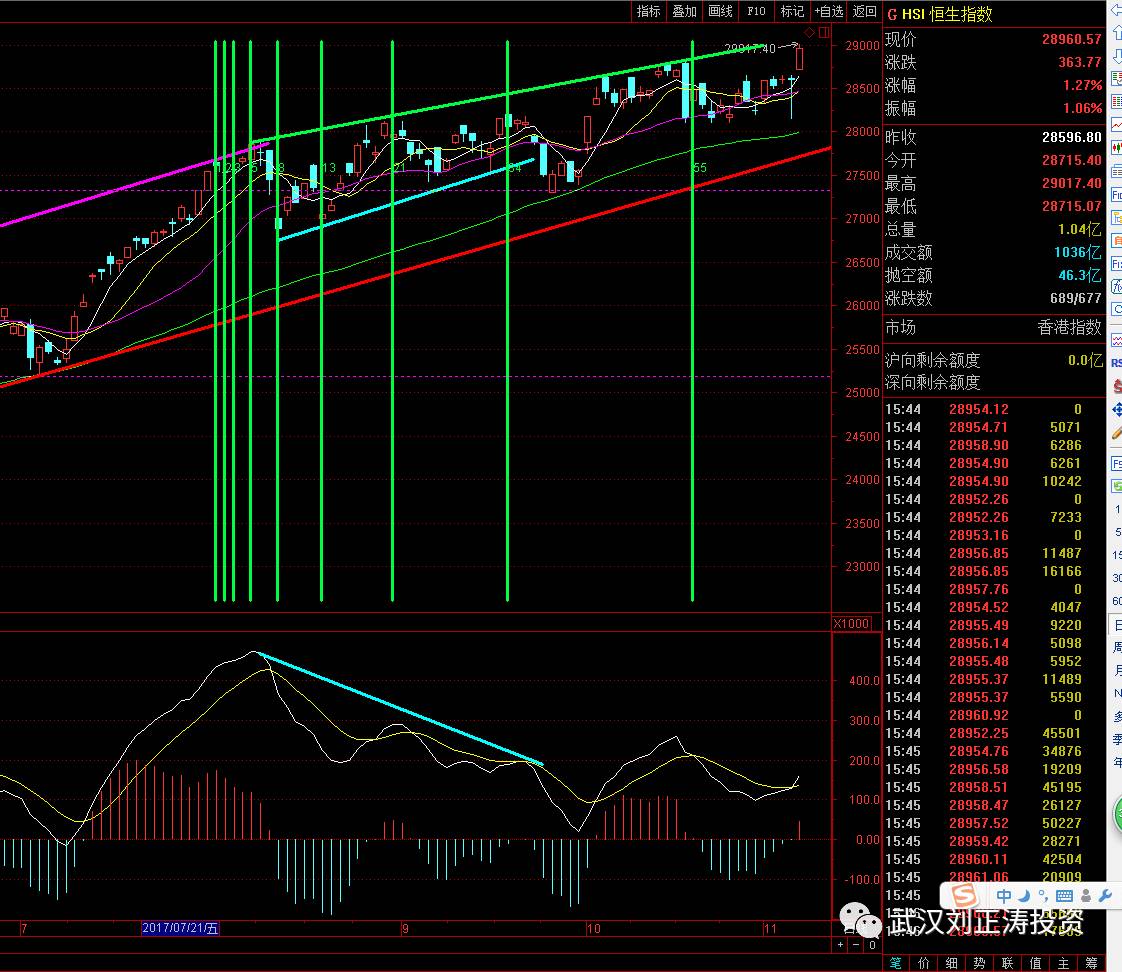 1、大趋势:上面这张图是港股自8月2日到今天的走势,港股处于什么位置呢?属于最强大的压力区域,整个指数涨幅接近60%,而沪指目前的涨幅30%,但是两者的时间窗口是一致的,因此接下来的转折点也是一致的,只是港股走势更强而已。