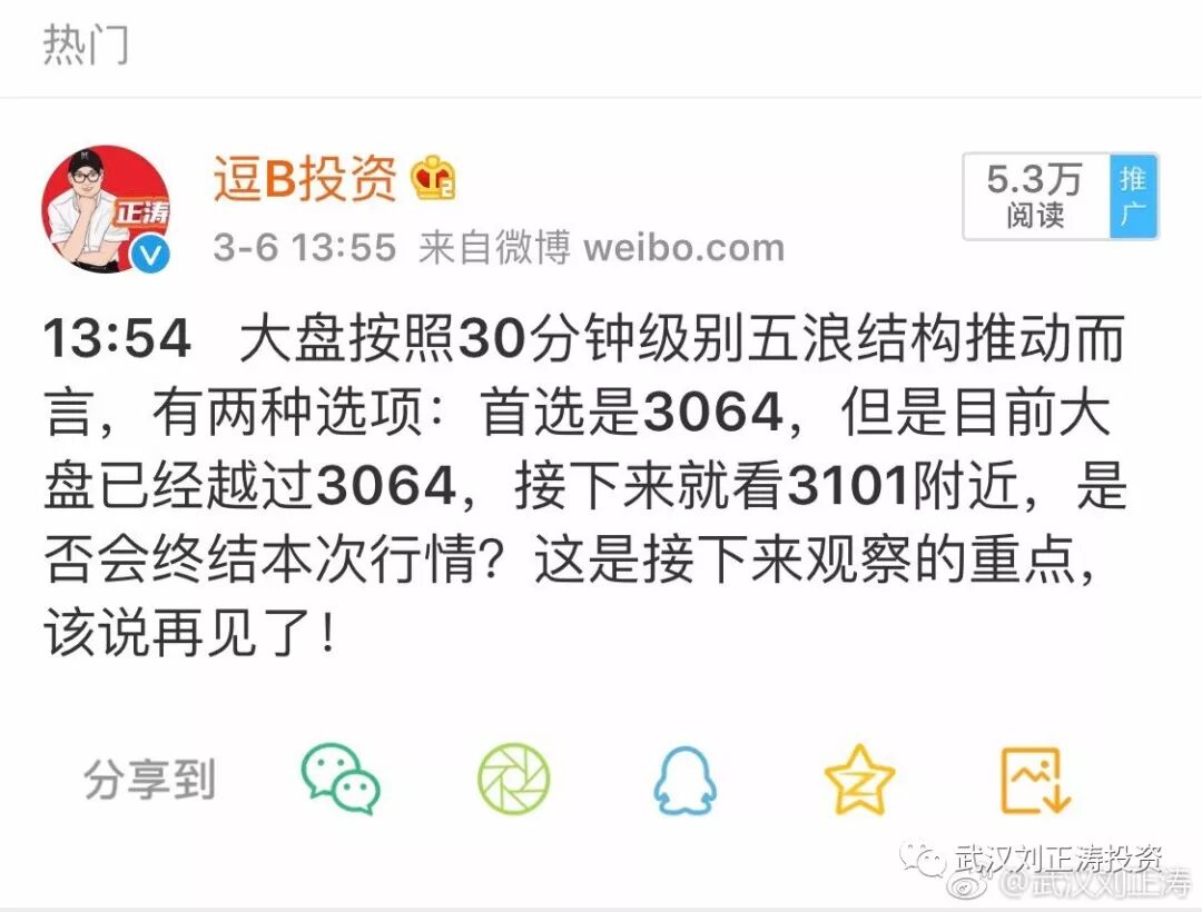 2、本次的5浪,一旦突破浪“3”的0.618的比例关系,向上就是1.618和1.382两个比例的选点这是在实战当中要特别注意的,尤其是学生粉,要反复琢磨这段话的含义。