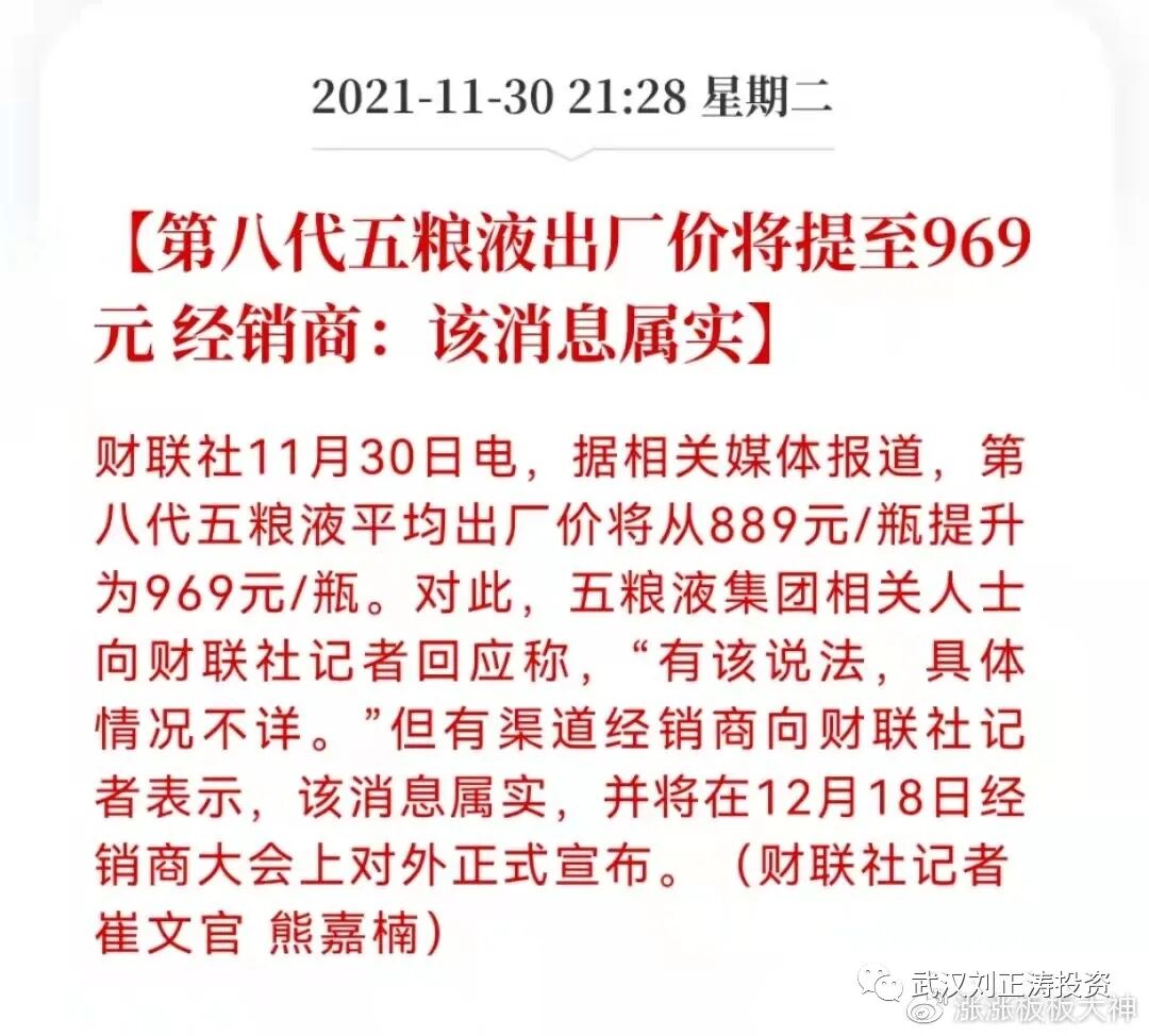https://mmbiz.qpic.cn/mmbiz_jpg/iceZhJccxWn5h1QpJXZaRr9pskIXKjayz1Z0jlibib3xPqHRnQZavpKfDanhrVtlFbKJOMHKic96epQvkMsSNOJXJg/640?wx_fmt=jpeg2、有渠道经销商表示,第八代五粮液平均出厂价将从889元/瓶提升为969元/瓶,将在12月18日经销商大会上对外正式宣布。