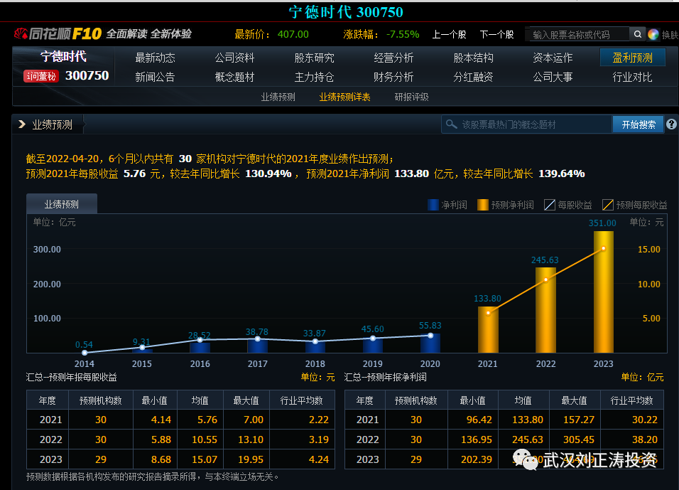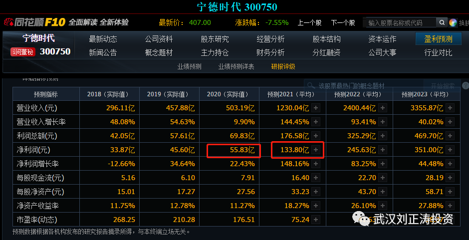 2、宁德时代为何暴跌?我们就用基本面来帮大家分析,看看下面这张图,在同花顺的盈利预测里面可以看得到的。2021年的实际的利润是133.8亿,股价最高点的估值是多少倍呢?692(最高股价)×23.3(股本)÷133.8=121倍,这就是2021年最高的估值121倍。