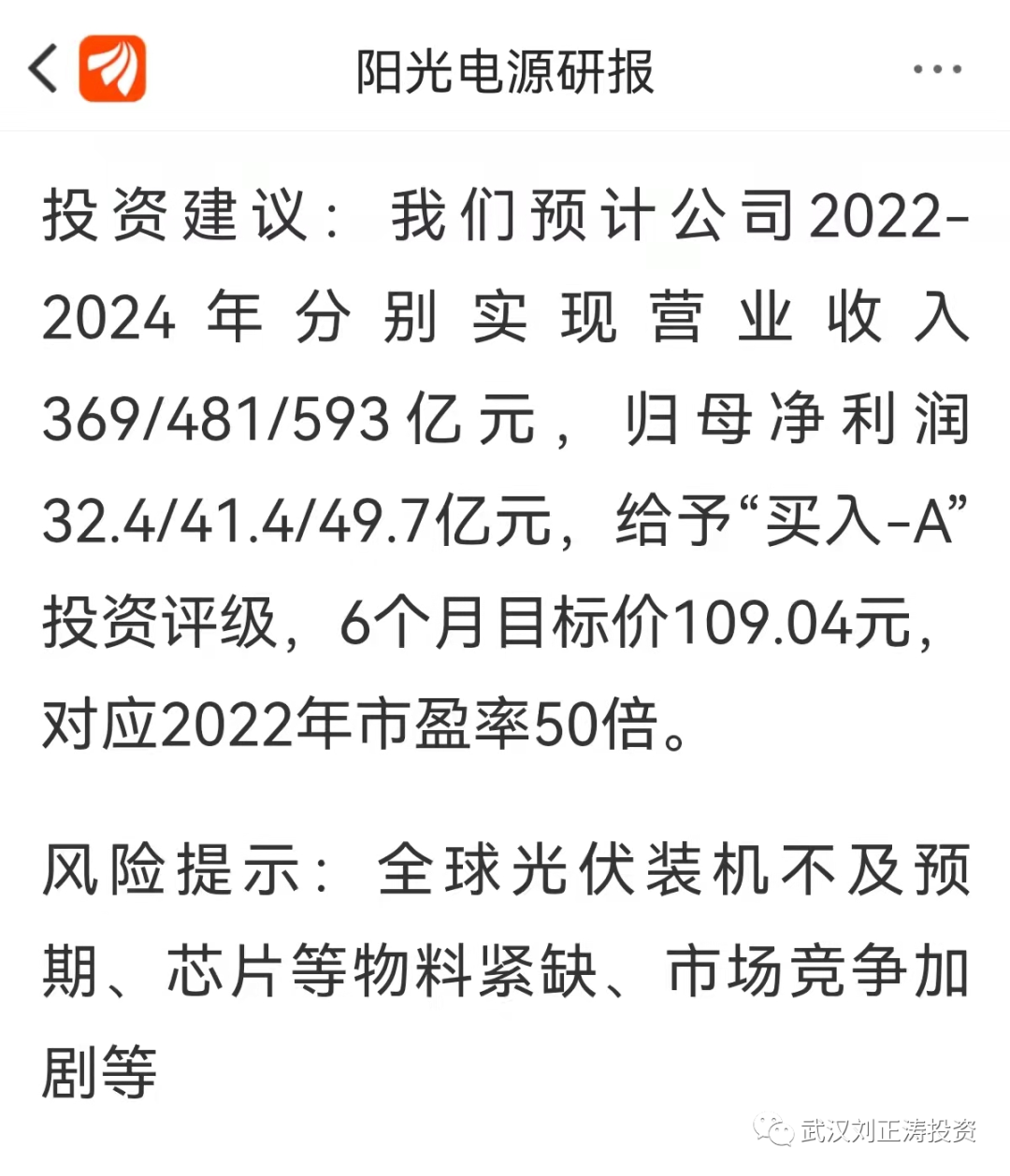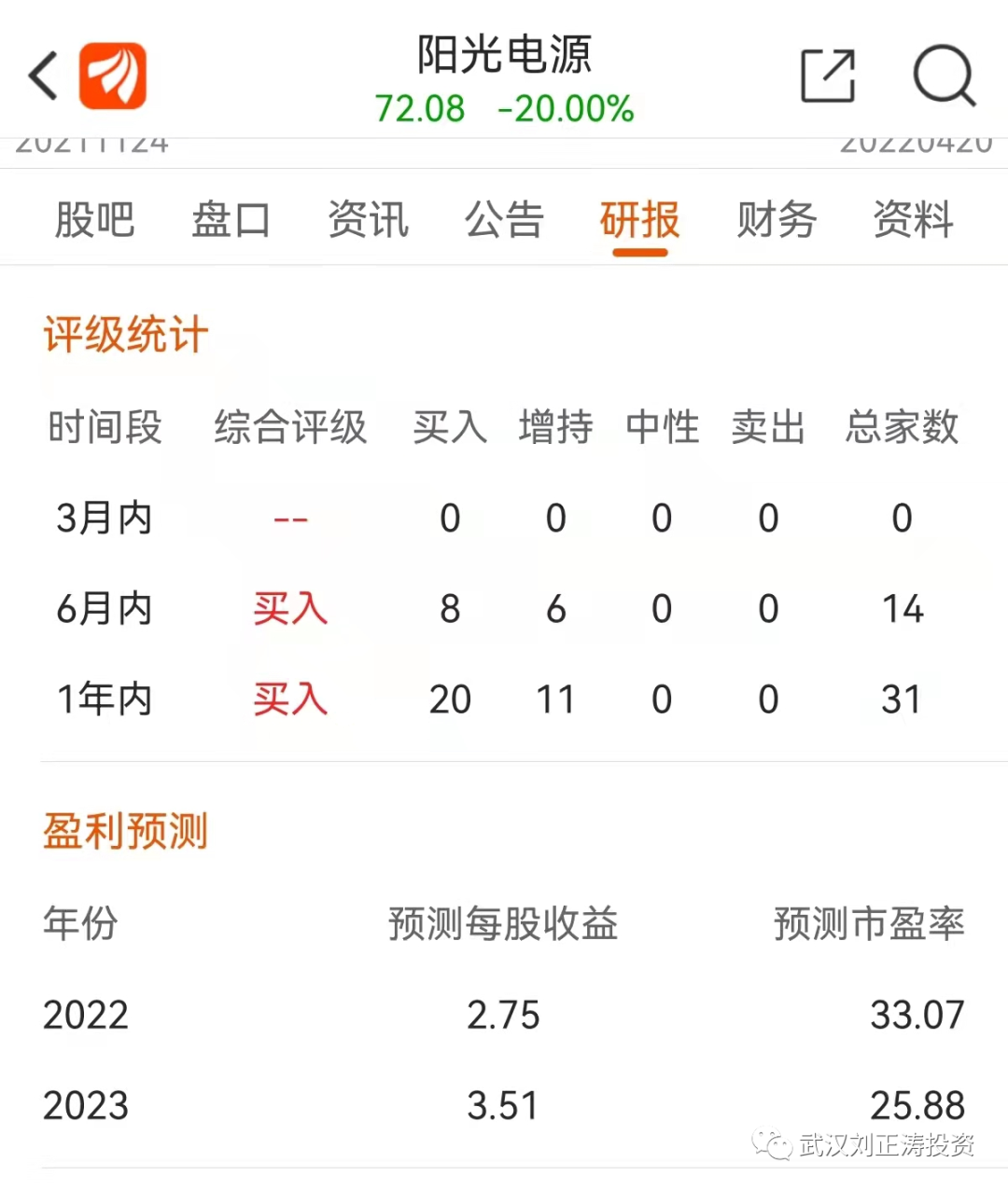 4、打开东方财富研报这一栏,机构预测2022年阳光电源每股收益2.75元,2023年盈利3.51亿元。去年年报每股收益1.08元,实际上已经低于了预期,所以击穿了年线。