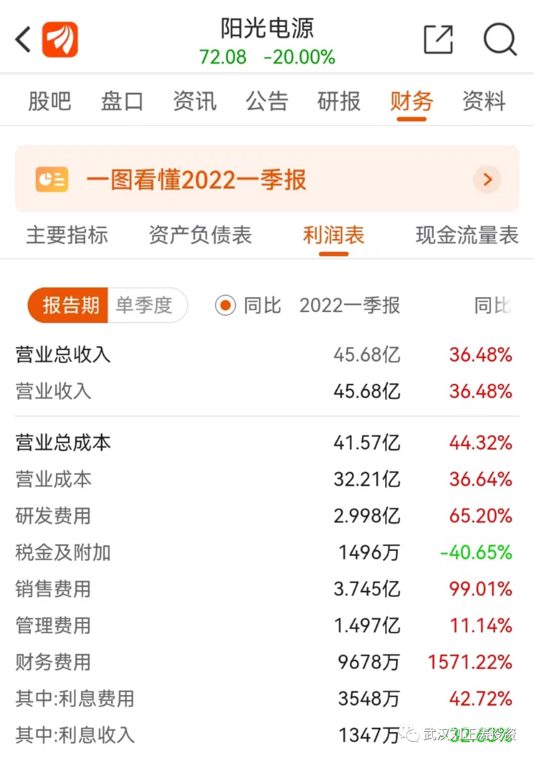 2、今年一季度的收入45.68亿同比增长36.48%,营业总成本41.57亿,同比增长44.32%,有没有发现这个玩意儿的毛利率很低?成本大幅增长的原因是什么?销售费用增长了99.01%;财务费用增长了15.71倍,什么意思?借钱借的太多了,利息就付了接近一个亿。研发费用增长了65.2%,技术难度加大,竞争激烈,投入研发是正常的,高杠杆的企业成本自然会重。