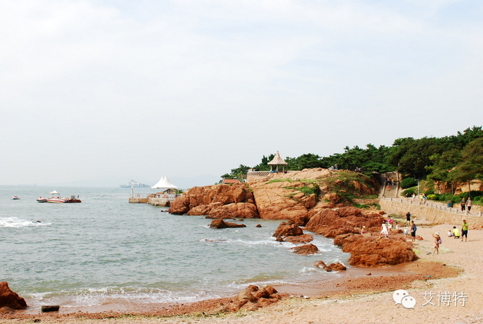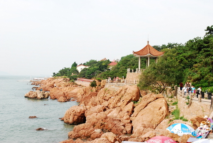 第一海水浴场。遥望小鱼山公园,山顶是览潮阁,俯瞰汇泉湾。