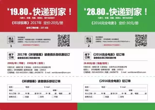 在这两张小海报的背面也有“2017《环球银幕》全年订阅及《2016完全电影》(包快递)”的征订单。