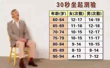 方法:坐在一张43厘米高的凳子上,以最快的速度站起来,再坐下,30秒内看能做多少次。