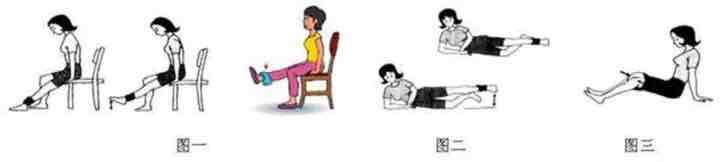 图一:勾脚抬腿练习,坐在凳子上或坐在床边训练,每次坚持10秒钟,然后放松10秒钟,再继续训练。 如果双侧均有疾病,可以双膝交替进行,不要双侧同时进行。每日上午30次,下午30次。一般训练6周会有明显的疼痛改善效果。(注意:腰椎有病变的患者只能坐着练习,不要躺着做,以免诱发腰部疼痛)