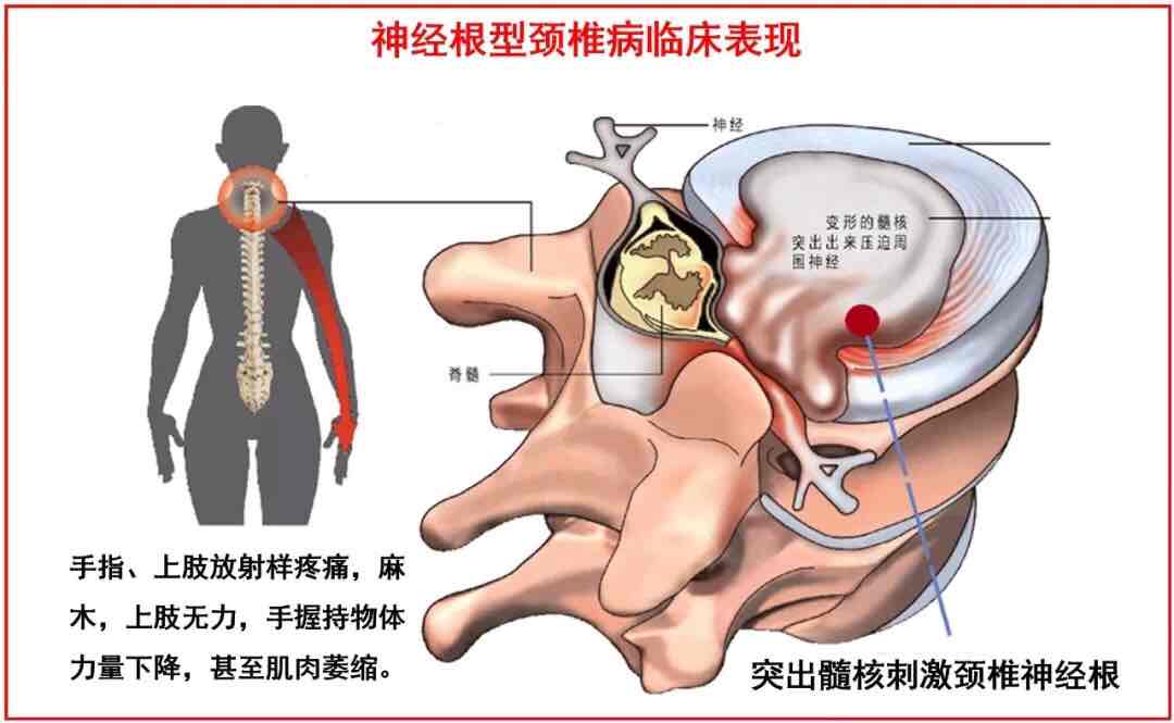 颈椎病变刺激或压迫到神经出现:手指、上肢放射样疼痛,麻木,如果长期压迫神经根,会伴随上肢无力,手握持物体力量下降,甚至肌肉萎缩。当患者颈部活动,或者用力咳嗽,打喷嚏时,这种症状会加重。因为神经分布存在节段区域性,虽然都是颈椎病,不同节段压迫表现出来的疼痛和麻木的部位及严重程度不一样。