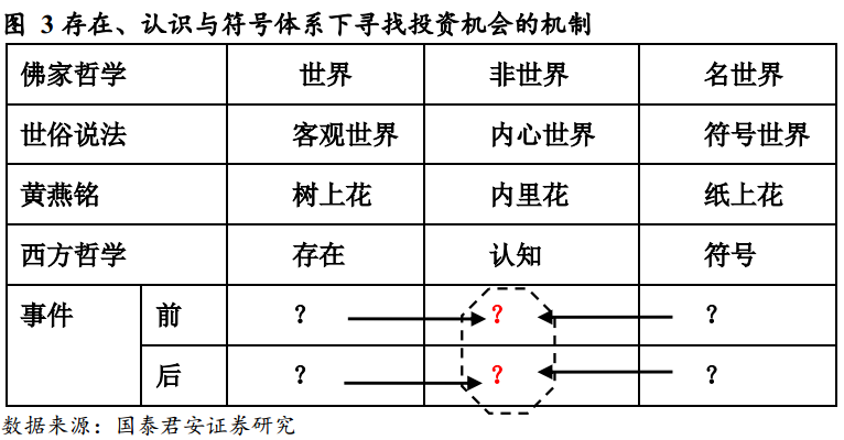 哲学不仅要帮助人们获得智慧,同时也要帮助人们借助智慧来解决现实问题,毕竟“色即是空”的后半句是“空即是色”。我们在透过现象看到事物的本质和规律后,还要用对本质和规律的理解来指导我们解决现实的问题。在日常的证券投资与研究中,上图中的哲学概念,可以帮助我们建立基本的证券研究方法论。我们需要讨论的问题是:1、股票价格究竟是树上花(存在)、心里花(认知)还是纸上花(符号)的反映?2、如果股票价格是心里花(认知)的反映,那么人们的内心世界(认知)是如何形成和变化的?3、如何用这种分析方法来寻找和把握股票市场的投资机会?关于这三个问题,我们分项解释,并举出案例。