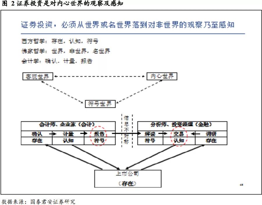 在证券研究中,国民经济的实际情况、上市公司经营的实际情况可以被理解为客观世界,投资经理或者分析师对国民经济的考察或者对上市公司调研而形成的认知可以被理解为内心世界,而国家统计局公布的国民经济统计报表以及上市公司公布的会计报表,其实是符号世界。