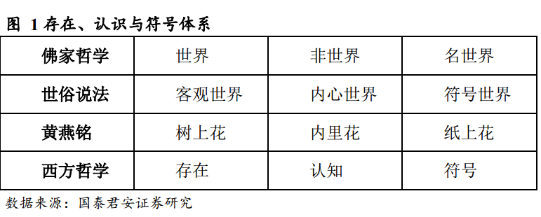 在20多年的证券研究实践中,我的感受是,要从哲学角度理解证券研究,并掌握科学的证券研究方法,首先应当能够正确区别存在、认知和符号三个概念,并能够运用这三个概念来寻找证券投资机会。树上的花,是客观世界;心里的花,是内心世界;纸上的花,是人类区别于一般动物而特有的、以文字和语言为载体的符号世界,符号是人与人之间沟通交流的渠道。三朵花分别代表了西方哲学中的存在、认知和符号三个概念。