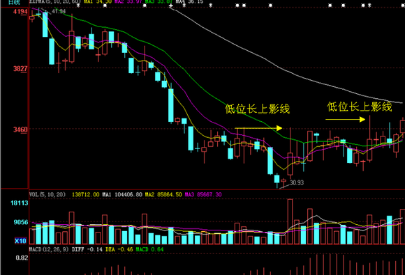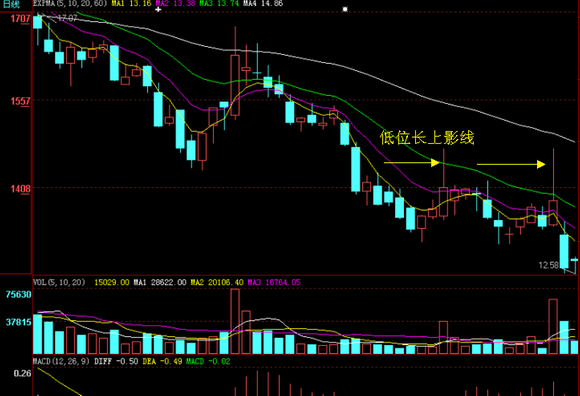 日线在股票走势的低位也会出现长上影线。低位出现的长上影线,可以看作是主力吸货,同时又不想让股价提前上涨的操控。有时候也是主力庄家在发动行情之前的试盘动作。但是总体来说,低位的长上影线之后的第2天以及以后的若干天,股价都不会上涨,有的还会有下跌的走势。这时候投资者不宜过早的买入,而是应当在走势形成多头排列,有成交量放大时再及时跟进。