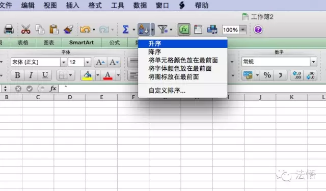 先选定拟排序的特定行或列,然后点击上述的排序按纽右边的黑色三角,就会弹出如下菜单,然后点击“升序”按纽,就可以实现对选定的特行或列的单元表格按升序排列。