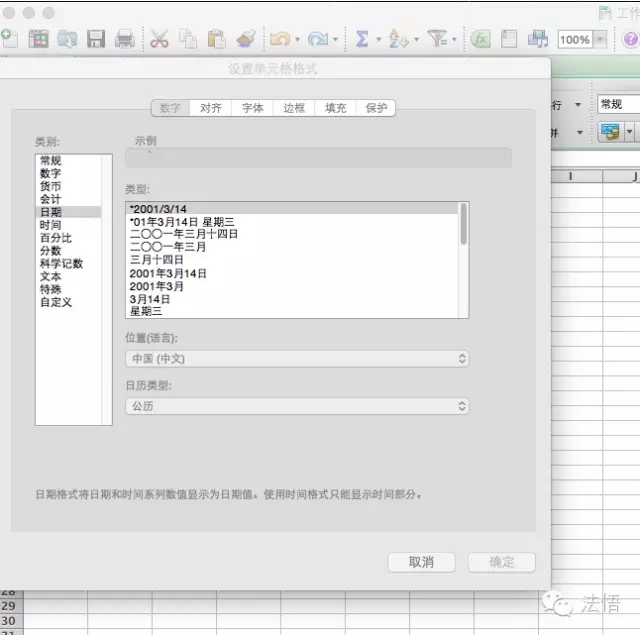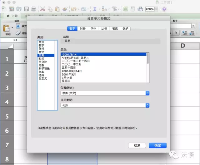 将光标移动至日期上方的“B”处,然后点击鼠标右键,在出现的菜单中选中“设置单元格格式”,然后选择“日期”,再选择“2001/3/14”格式,最后点击“确定”即设置完毕。具体操作见图2和图3。