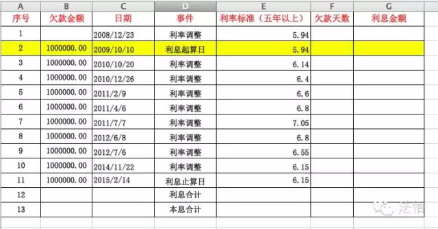 5、第三行和倒数第二行的基础数据,均为利息起算日和截止日之间的利率调整数据,该数据按如下方式录入: