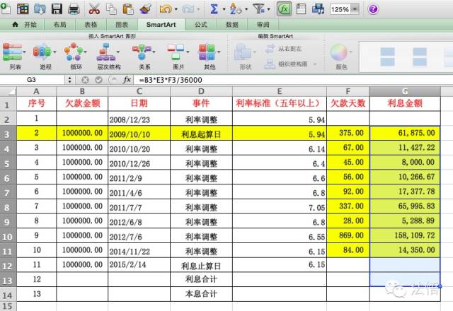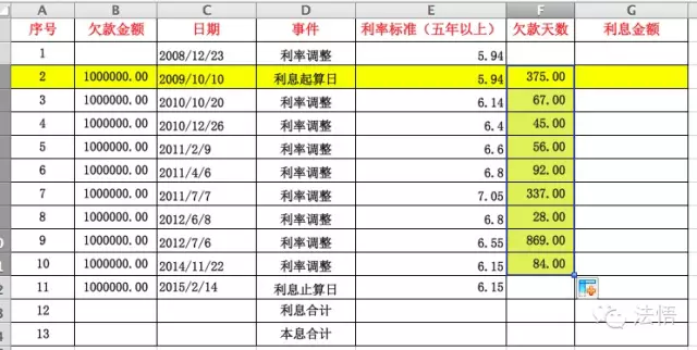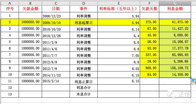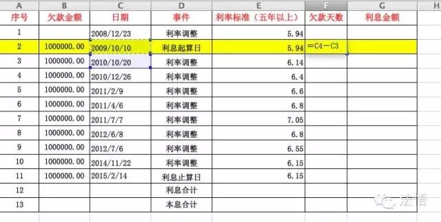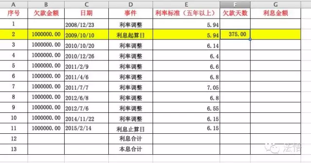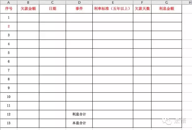 1、需要录入的基础数据有:序号、欠款金额、日期、事件、利率标准;