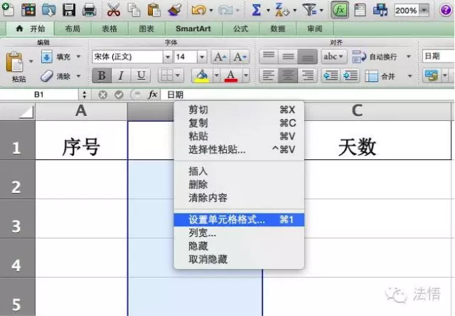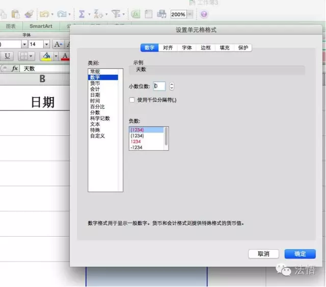 将光标移动至日期上方的“C”处,然后点击鼠标右键,在出现的菜单中选中“设置单元格格式”,然后选择“数字”,再将“小数位数”设置为“0”,最后点击“确定”,即设置完毕。具体操作见如下图4: