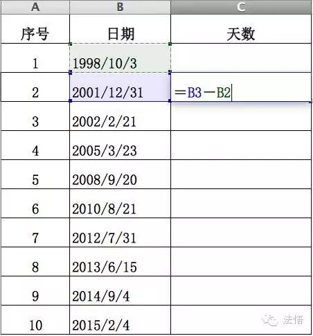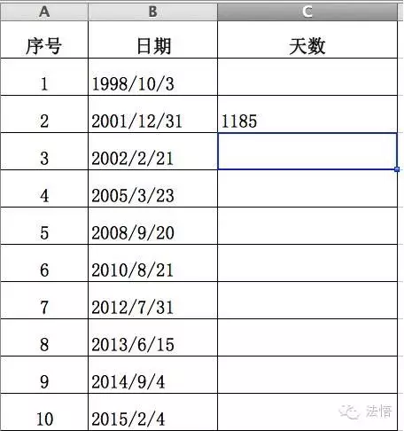 如果仅利用Excel计算器功能计算各时间点的天数,并没有显示Excel的强大功能。程序作为工具最大的特点在于避免重复性的工作,而上述计算方式,显然存在大量重复性的工作,因为在每一组数据的计算过程中,都重复了第一组数据的计算公式。下面我们通过这个“神操作”,能够有效避免一切重复,实现瞬间就完成所有各阶段的天数计算,具体步骤如下: