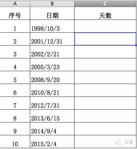 因为是后一个日期减去前一个日期,因此应将计算结果显示在“C”列中与“2001/12/31”对应的位置,然后点击该单元表格即完成选定。具体操作见图6。