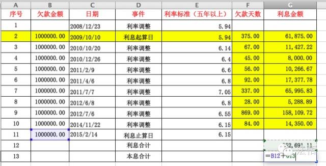 用光标选中“本息合计”所在行与“利息金额”列所对应的单元表格,然后键入“=”,点击“利息合计”金额(显示B12),键入“+”,点击序号为11所在列显示的“欠款金额”即“1000000.00”(显示G13),见图13。然后按回车,就得出“本息合计”金额,见图14。