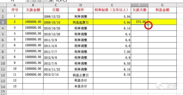 用光标选中序号为2的所在行中对应的“欠款天数”的单元表格,然后键入“=”,点击“2010/10/21”(显示为“C4”),键入“-”,点击“2009/10/10”(显示为“C3”),上述操作完成后显示为“=C4-C3”。然后回车,即得出2010年10月20日(利息起算日)与2009年10月10日(欠款期间首次利息调整日)期间的“欠款天数”为375天。具体操作见图3和图4。
