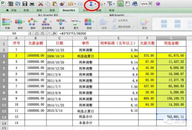 用光标点中“利息金额”中的第一组数据“61,875.00”后,按住鼠标,然后将光标拖至“利息合计”所对应的“利息金额”所在列的单元表格,然后松开鼠标。然后点击求和键(见图12中的红色圆圈处的符号),此时,在“利息合计”行与“利息金额”所在列对应的单元表格中显示的数据就是所有各期间的“利息金额”总和。具体操作见图11和图12。