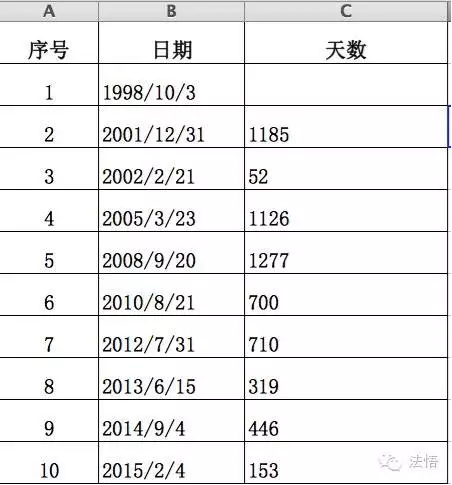 2.比照上述第一组数据的计算方式,分别计算以后各组的计算结果,见图9。图9中“天数”中的每一组数据均为所对应的日期与前一个日期期间内的天数。