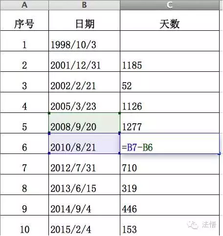为了保证该神操作的准确性,应当对这一操作的准确性和有效性进行校验。如选定序号为第6行的计算数据,用鼠标点到第六行所对应的天数即“700”处的单元表格,然后双击鼠标,就会显示该数据的计算公式为“=B7-B6”,即2010年8月21日减2008年9月20日所得的差值,完全正确。具体见图12。