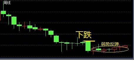 周线,从图上我们看到这是一波连续下跌的走势,连续下行,中间出现过修正,但是我们发现形态下影线连续很多,但是反弹力度没有,导致后面再度下行,而短期而言,周线大阴后面,反弹7周,价格却无法突破下跌阴线的顶部,依然是一个只见时间走,不见力度的反弹走势,这明显是一种弱势修正手法,是趋空修正。