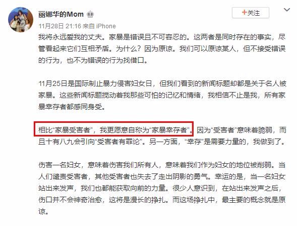 她选择原谅丈夫李阳(PS:注意,是丈夫,而不是前夫),原因是”我爱他“,同时她还称“原谅”是给自己的礼物,也是给李阳的礼物。