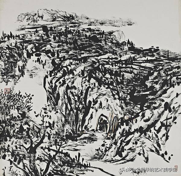 我们再来分析吴冠中先生为北京饭店所绘的那幅大写意作品《清奇古怪》。该作画面以浓墨变化的线条为主要骨架,从线的效果上推测,吴冠中先生可能制作了一种特殊的工具,使浓墨能不断地通过工具边沿流向纸面。他必须疾速运其所用之“笔”,仅凭直觉控制整个画面的绘制。由于墨汁酣饱,一触纸面,便迅速发挥出宣纸特有的扩散、洇晕功能。又由于行“笔”的速度,使得横向的扩散受到纵向运“笔”速度的控制,分寸感把握得恰到好处。这种有意蕴、有弹性、有力感、有质感、有量感的线,构成了一种流畅中含虬曲的运动之势。这种奔腾涌动的富有节奏的生命律动线和叠压的色彩细线、润滑流畅的淡墨线形成的三重变奏,势若惊鸿游龙,忽聚忽散,忽强忽弱的飞动引来了点的回响,或若天女散花,或若崩石溅浪,时疏时密,时隐时现。此时,传统文人画的点线符号全然以“陌生”的面貌呈现,而现实画面的物象或者已经依稀不辩,或者已经无关紧要。这些流动的点、线、墨、色的处理形式始终都有强烈的、主观的意识在,并迸发出最深沉、最炽热的激情,将对所绘对象的最有遐思的感受寄情于点画之间、楮墨之上。但构成的“象”,初观之下却使人感到混沌、吃惊,甚至感到难以接受、甚是费解,而这恰恰是一种艺术语言陌生化的处理,利用工具和材料的变化及构成形式的抽象以求异,使表现语言受阻、扭曲,所绘形象朦胧、混沌,从而延长了被认识和接受的时间,打破了惯常的情绪体验和欣赏习惯,使人在持续的体味过程中,不断挖掘层出不穷的潜在之“象”,延长了审美感知过程。其效果的产生都源于对绘画表现语言的探索,解构而又重构,使呈现之象与人们的经验之象产生巨大的反差。