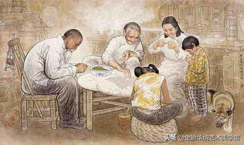 《悄悄话》中祖孙关系的天伦之乐溢于言表;《捏扁食》呈现的家庭氛围温馨和谐;《游子归》是根据唐代诗人孟郊的《游子吟》创作的:“慈母手中线,游子身上衣。临行密密缝,意恐迟迟归。谁言寸草心,报得三春晖?”画面上在昏暗的油灯下缝补的慈母和依偎在母亲身边的游子,正是王有政和母亲真实生活的写照,也是他对这首著名诗篇的亲身体验和图像阐释。