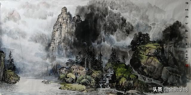 山水画难就难在山与水的契合。山水不契,意韵尽失。利川打破水的配角地位,山水并茂,交相辉映,相得益彰。客路青山外,行舟绿水前。水借山势而柔情百媚,山得水美而挺秀伟岸,山从水出,水从石山,山重水复,浑然一体,井然不紊。显现了创作者深厚的艺术功底和对大画面的娴熟驾驭能力。