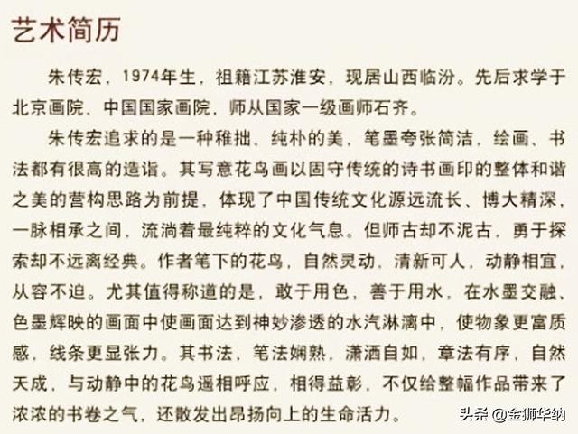 朱传宏的书画作品:总体的看风格非常明显,行笔潇洒、用墨沉稳、作品气格高,容易感染人,着色雅致。是传统延续下来的画法,从作品中能看到徐渭、八大、虚谷、吴昌硕、齐白石等历代大师的影子。