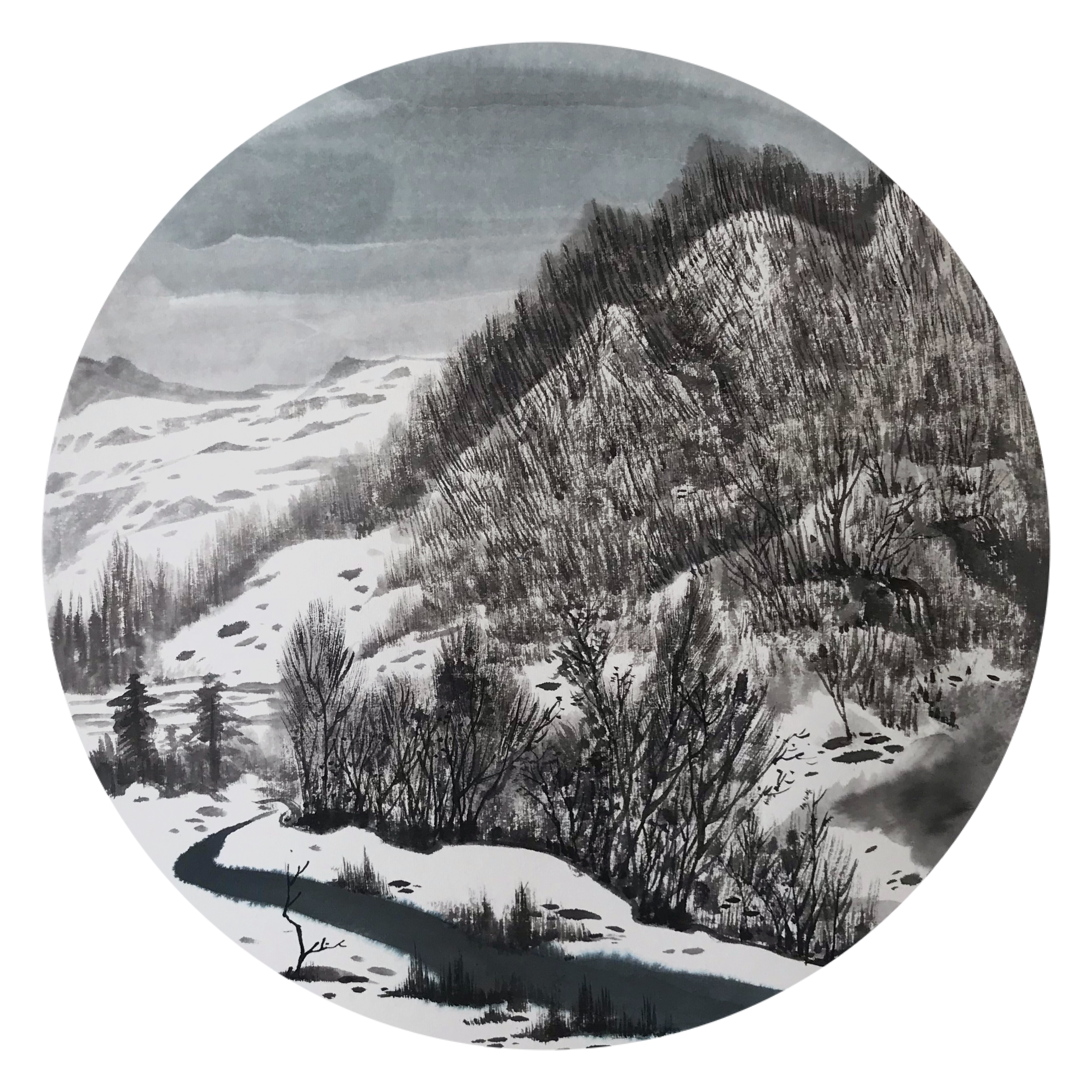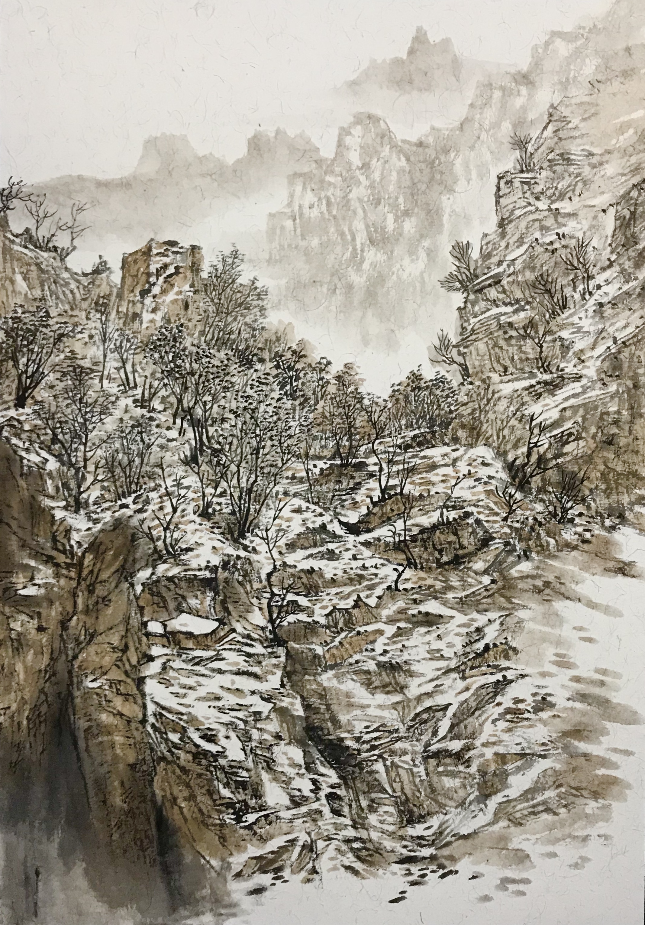 雪花的飘落是画家内心音符的悦动。对于王国梁而言,雪景是他最为喜爱的绘画内容,也是富于挑战的题材。所以,即使天气再寒冷、道路再泥泞也没有阻挡他去写生的脚步。创作源于生活,这些年来,王国梁用脚步丈量祖国的山山水水,无论是秦岭还是祁连山,无论是陕北高原还是江南小镇,都留下他身背画夹的身影,也都有他笔墨的记录与表达。