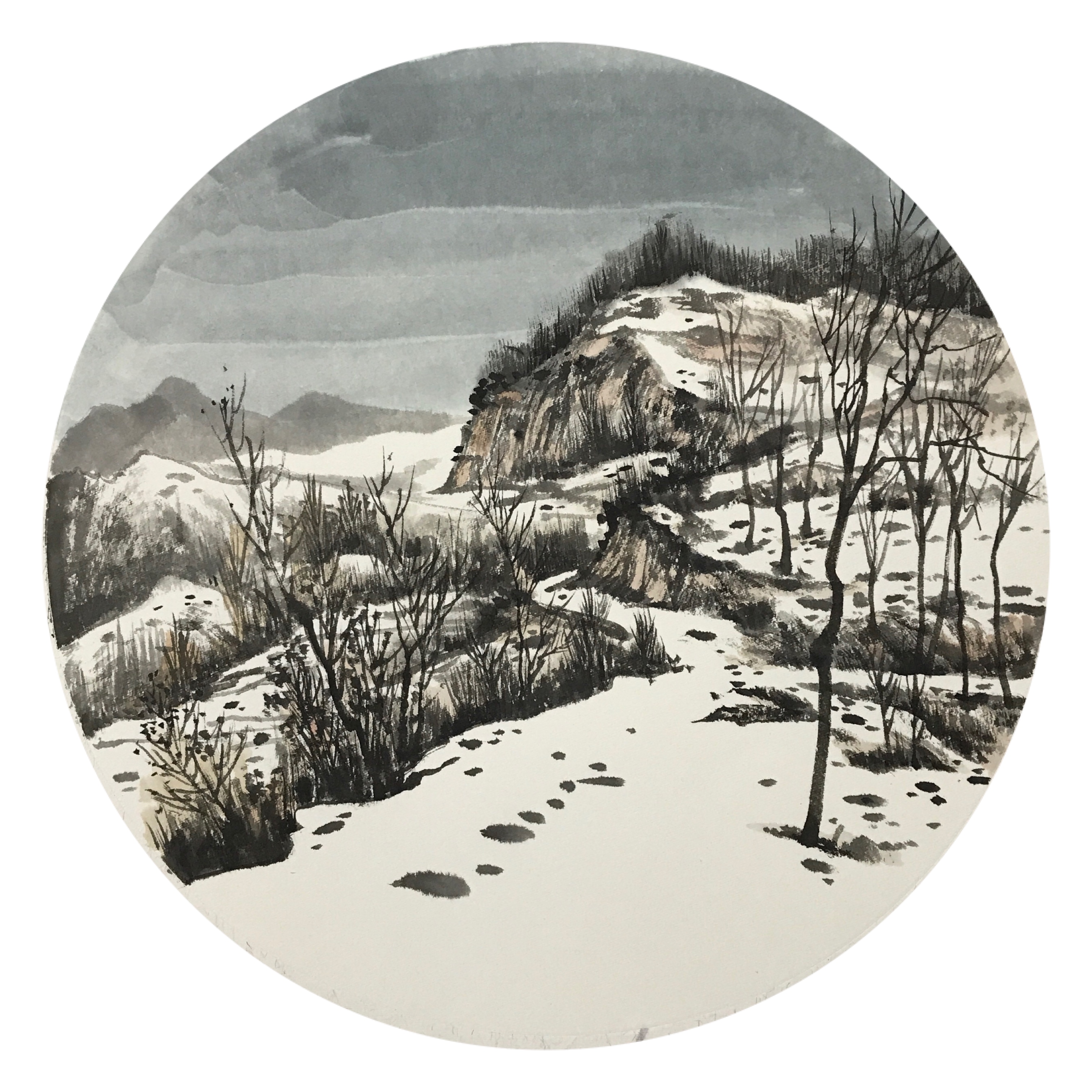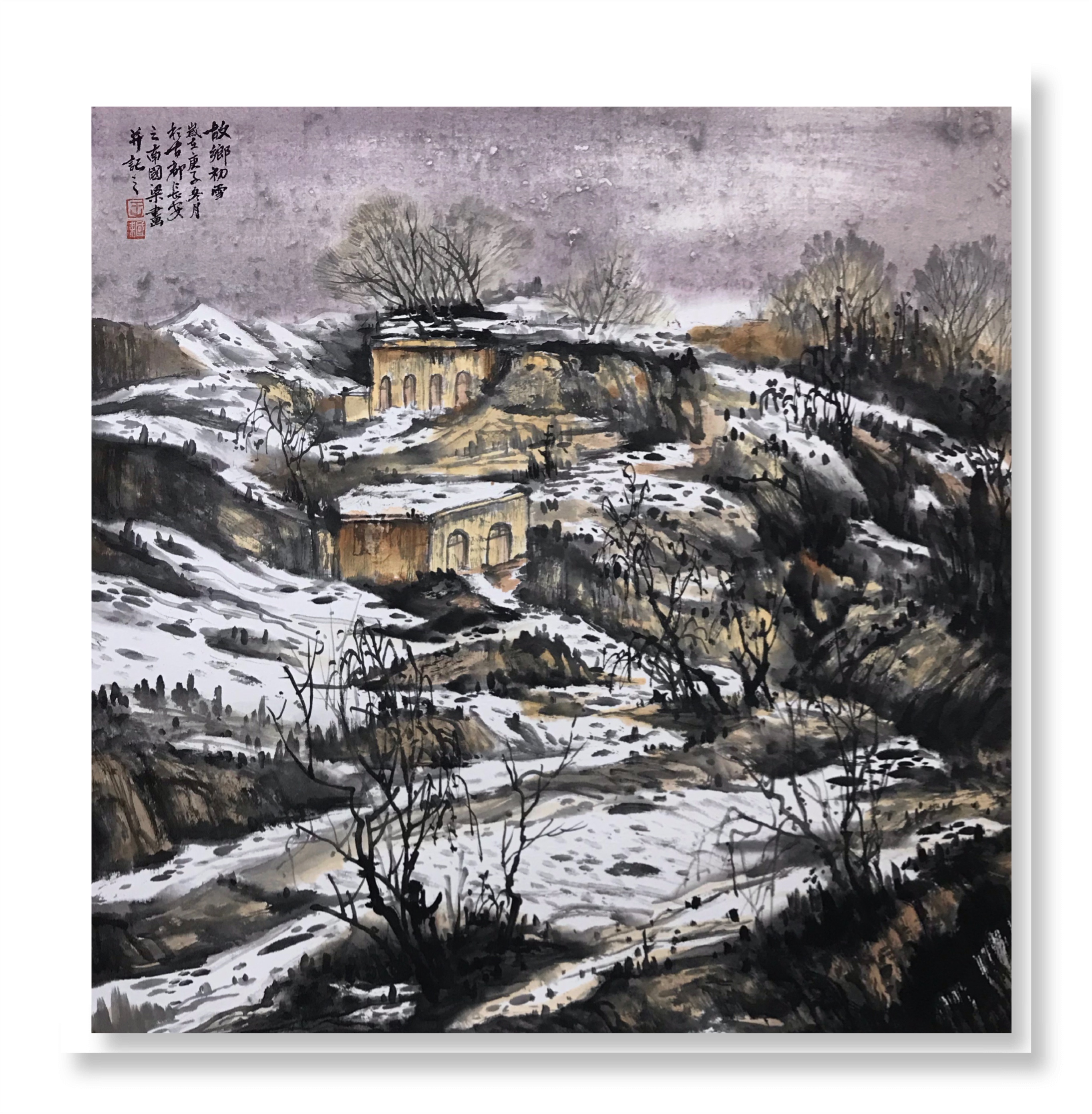 国梁笔下的雪景是他眼中的,也是他心中的。从小生长于秦岭腹地的他最难忘的便是儿时的雪天,那大自然恩赐的银色山野,那份融合了成长历程的雪花回忆始终在他记忆深处,藉由大雪纷飞时节便映入脑海,于是一幅幅雪景图便从心中幻化纸上。有一幅名为《故乡初雪》的作品可以很清晰地诠释画家的情感表达:浑厚的土塬、温暖的窑洞,清冽的寒风似乎在讲述故事;风中的枝丫、暗淡的天空,淡云和积雪,像是秘诉衷肠。片片留白承载的是白雪的记忆,也映射着淡淡的乡愁。这雪中的故乡可以是作者的,也可以是观者的,因为那份故乡亲情的通感已深深嵌入画面之中。